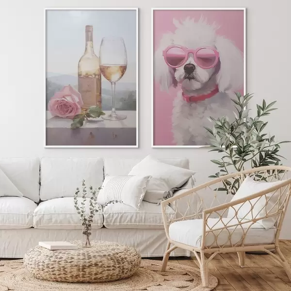 Poster Een fles en een glas wijn en een poedel met een bril, imitatie schilderij N° d01021