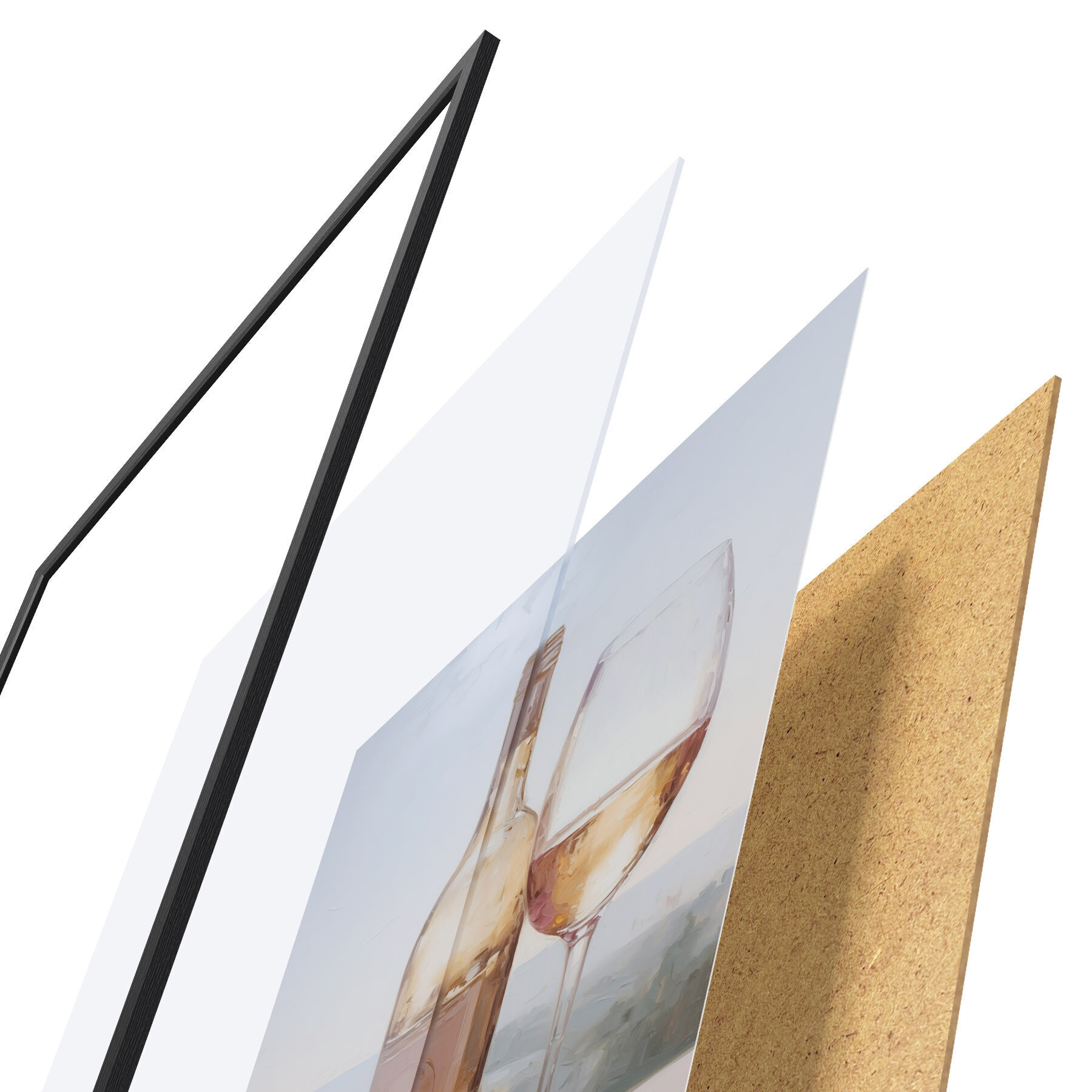 De poster bestaat uit een frame, plexiglas, geprinte afbeelding en spaanplaat achterkant. De poster kan meteen aan de muur worden gehangen dankzij de bevestigingen op de achterkant.
