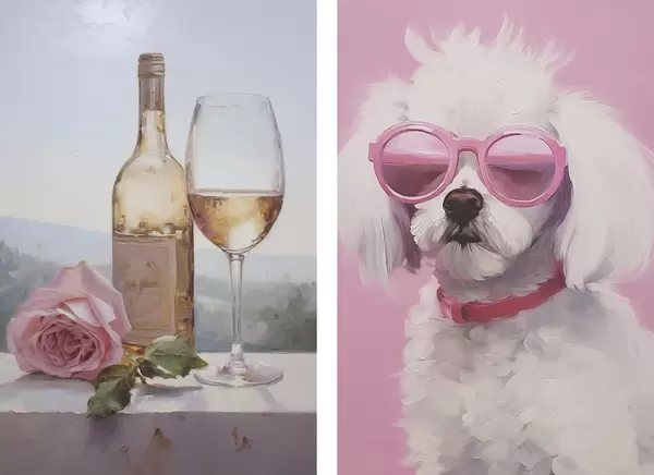 Poster Een fles en een glas wijn en een poedel met een bril, imitatie schilderij N° d01021