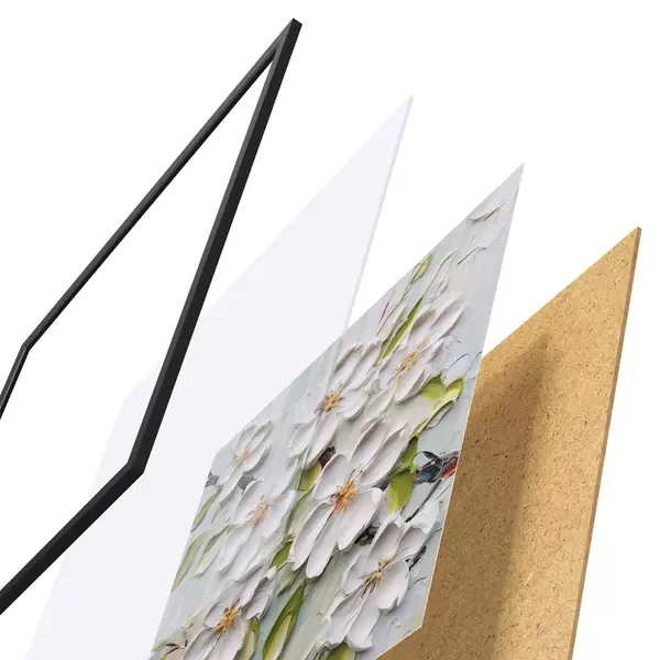 De poster bestaat uit een frame, plexiglas, geprinte afbeelding en spaanplaat achterkant. De poster kan meteen aan de muur worden gehangen dankzij de bevestigingen op de achterkant.