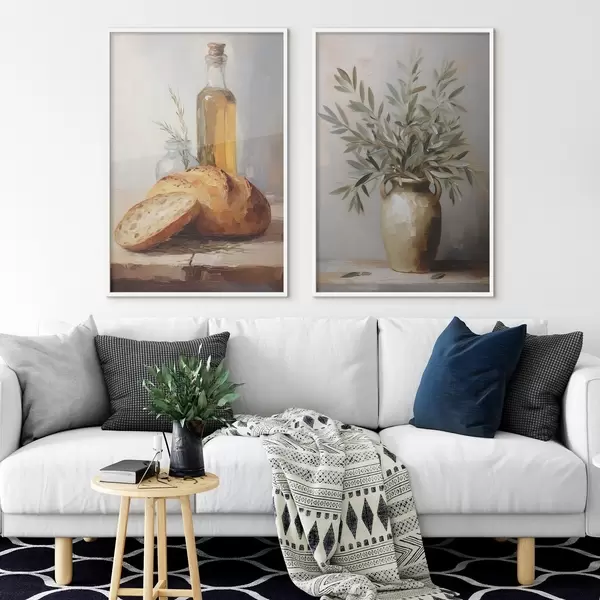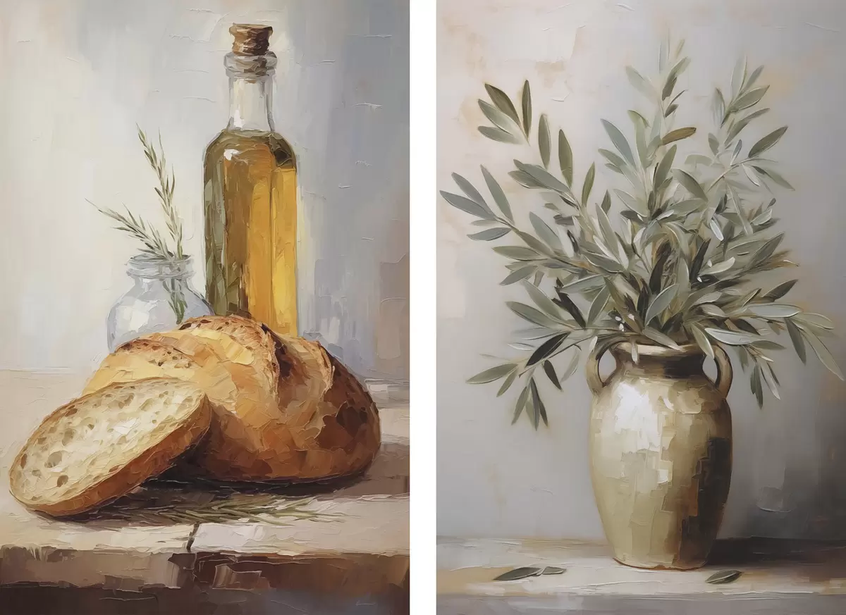 Poster Olijftakken in een vaas, brood en een fles olie, imitatie schilderij N° d01035