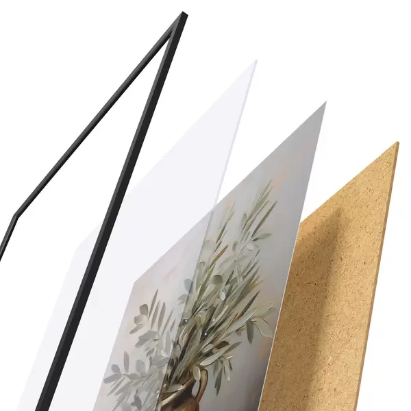 De poster bestaat uit een frame, plexiglas, geprinte afbeelding en spaanplaat achterkant. De poster kan meteen aan de muur worden gehangen dankzij de bevestigingen op de achterkant.