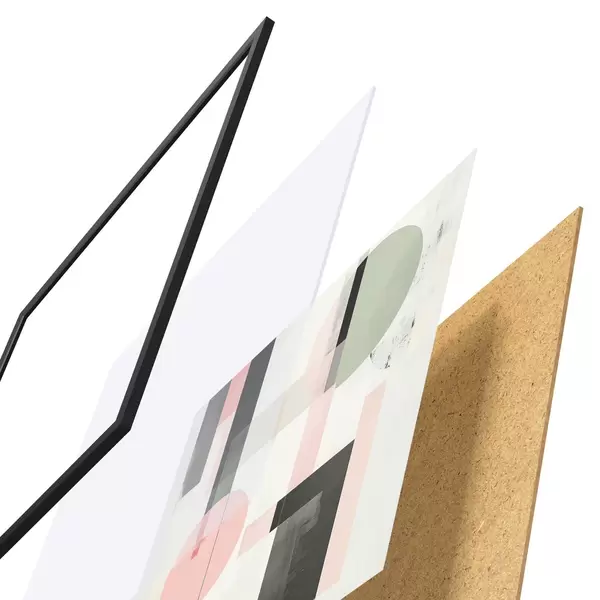 De poster bestaat uit een frame, plexiglas, geprinte afbeelding en spaanplaat achterkant. De poster kan meteen aan de muur worden gehangen dankzij de bevestigingen op de achterkant.
