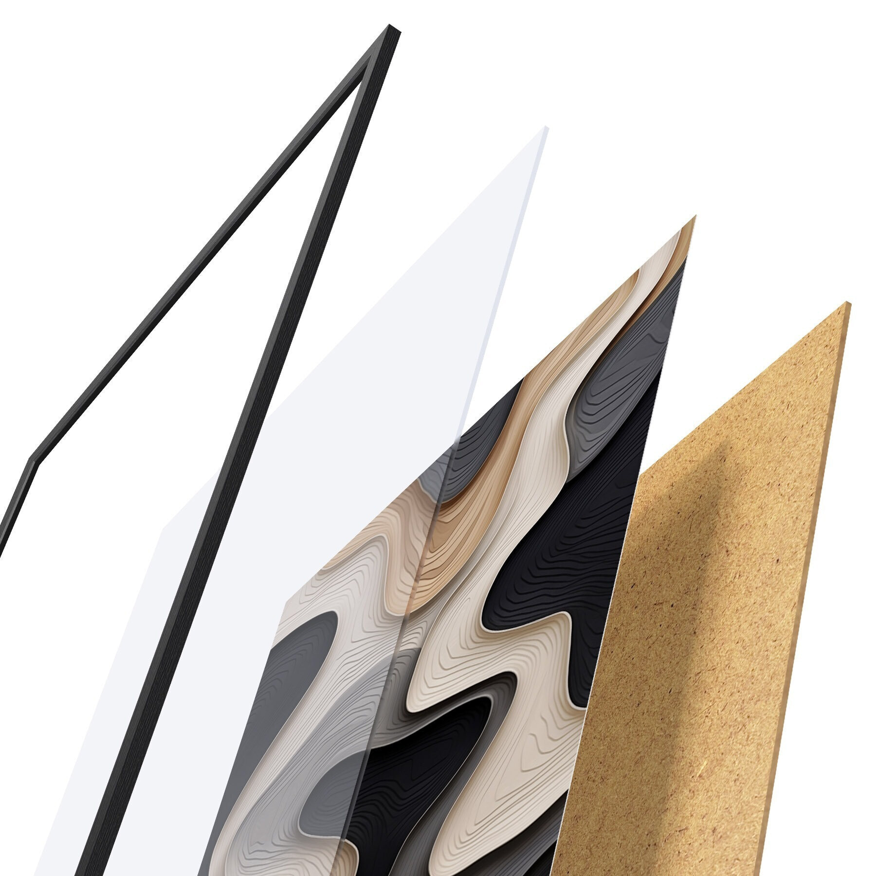 De poster bestaat uit een frame, plexiglas, geprinte afbeelding en spaanplaat achterkant. De poster kan meteen aan de muur worden gehangen dankzij de bevestigingen op de achterkant.