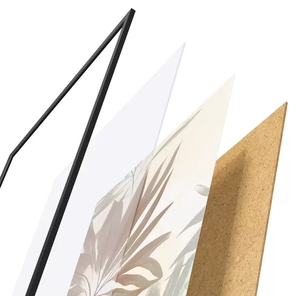 De poster bestaat uit een frame, plexiglas, geprinte afbeelding en spaanplaat achterkant. De poster kan meteen aan de muur worden gehangen dankzij de bevestigingen op de achterkant.
