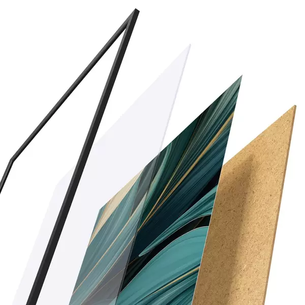 De poster bestaat uit een frame, plexiglas, geprinte afbeelding en spaanplaat achterkant. De poster kan meteen aan de muur worden gehangen dankzij de bevestigingen op de achterkant.