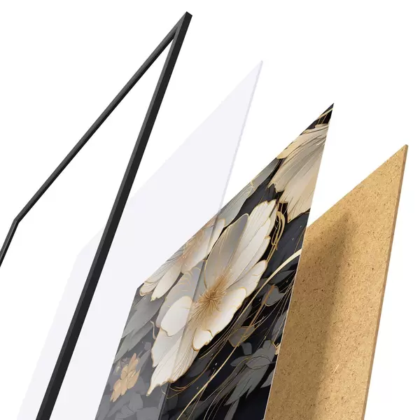 De poster bestaat uit een frame, plexiglas, geprinte afbeelding en spaanplaat achterkant. De poster kan meteen aan de muur worden gehangen dankzij de bevestigingen op de achterkant.