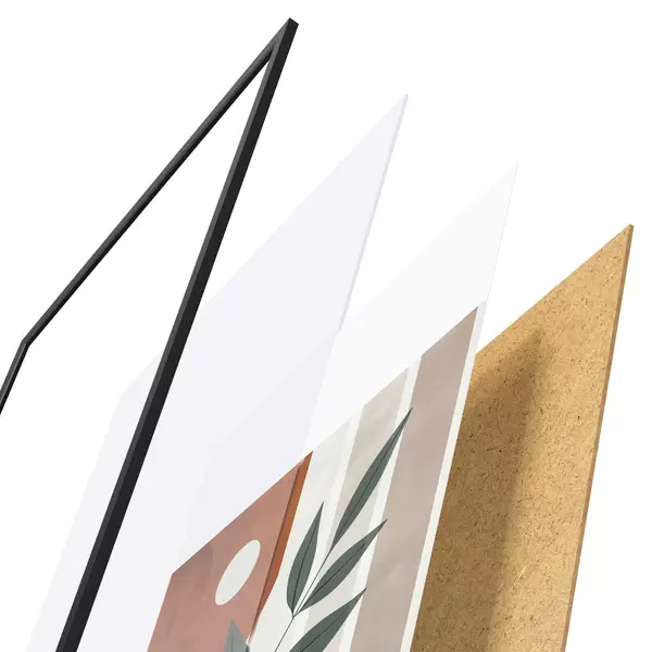 De poster bestaat uit een frame, plexiglas, geprinte afbeelding en spaanplaat achterkant. De poster kan meteen aan de muur worden gehangen dankzij de bevestigingen op de achterkant.