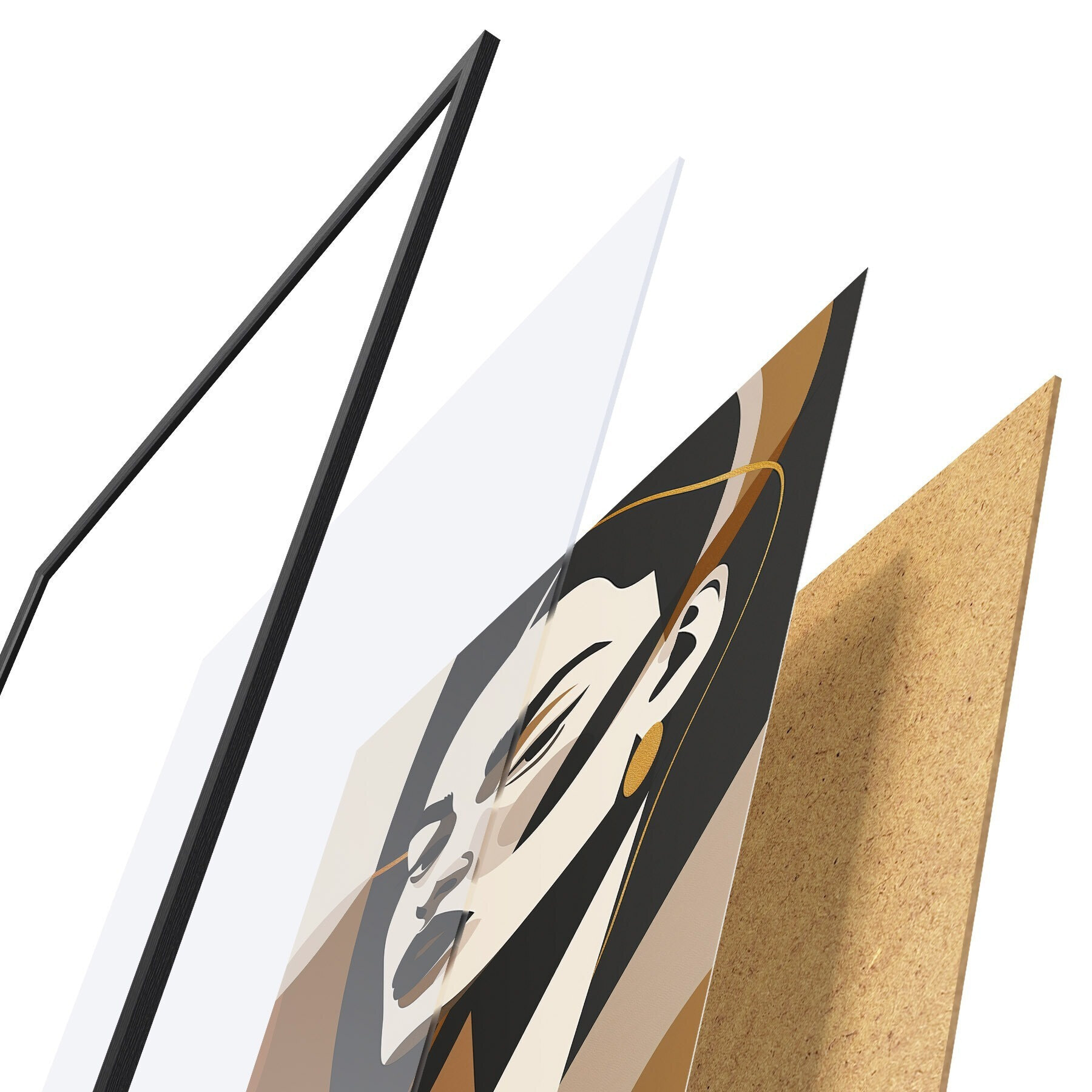 De poster bestaat uit een frame, plexiglas, geprinte afbeelding en spaanplaat achterkant. De poster kan meteen aan de muur worden gehangen dankzij de bevestigingen op de achterkant.