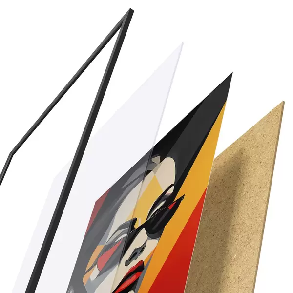 De poster bestaat uit een frame, plexiglas, geprinte afbeelding en spaanplaat achterkant. De poster kan meteen aan de muur worden gehangen dankzij de bevestigingen op de achterkant.