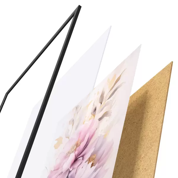 De poster bestaat uit een frame, plexiglas, geprinte afbeelding en spaanplaat achterkant. De poster kan meteen aan de muur worden gehangen dankzij de bevestigingen op de achterkant.