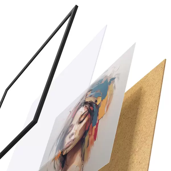 De poster bestaat uit een frame, plexiglas, geprinte afbeelding en spaanplaat achterkant. De poster kan meteen aan de muur worden gehangen dankzij de bevestigingen op de achterkant.