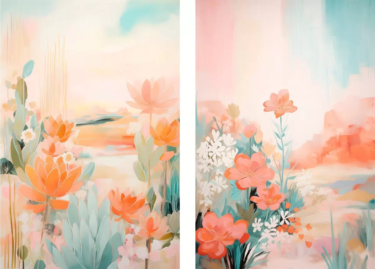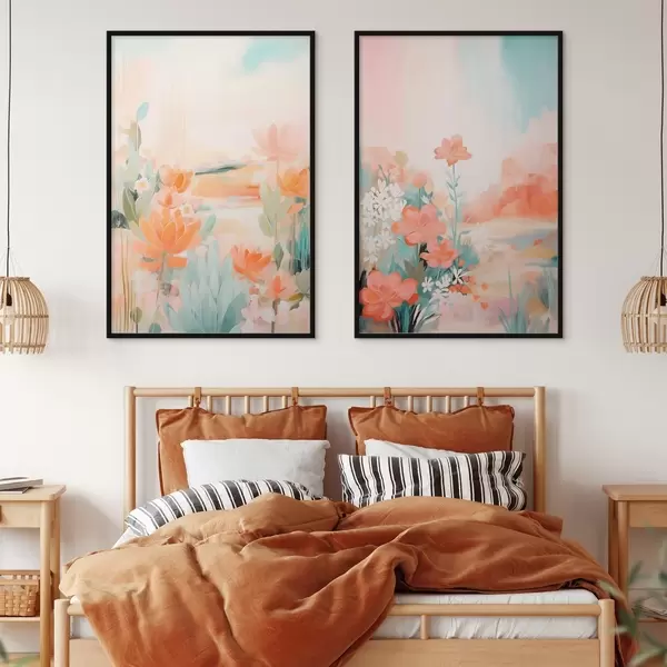 Poster Bloemmotieven in pasteltinten tegen de achtergrond van een licht mistige vallei N° d01085