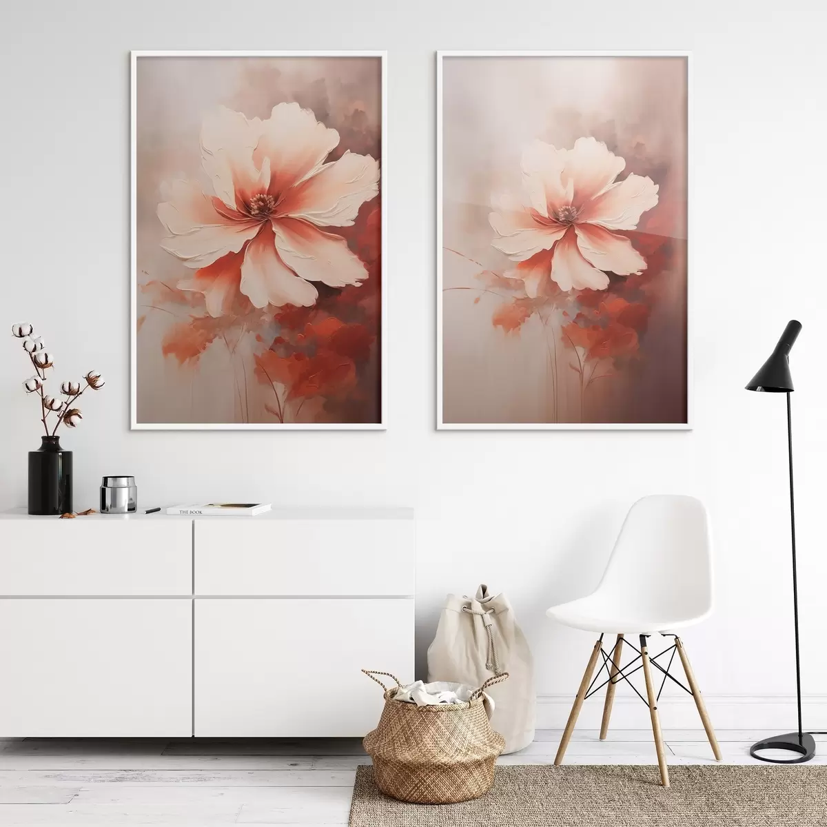 Poster Bloemensamenstelling: witte en crèmekleurige bloemblaadjes, koraalkleurige accenten en een zachte, mistige achtergrond N° d01088