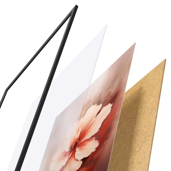 De poster bestaat uit een frame, plexiglas, geprinte afbeelding en spaanplaat achterkant. De poster kan meteen aan de muur worden gehangen dankzij de bevestigingen op de achterkant.