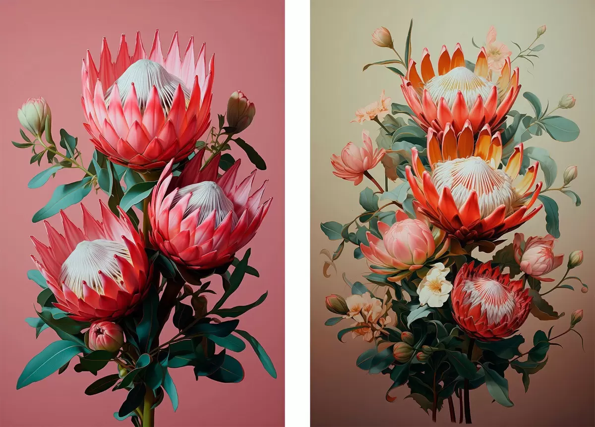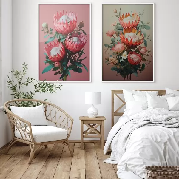 Poster Proteas in twee stemmingen: rijke roze achtergrond en een warm olijfgroen kleurverloop N° d01092