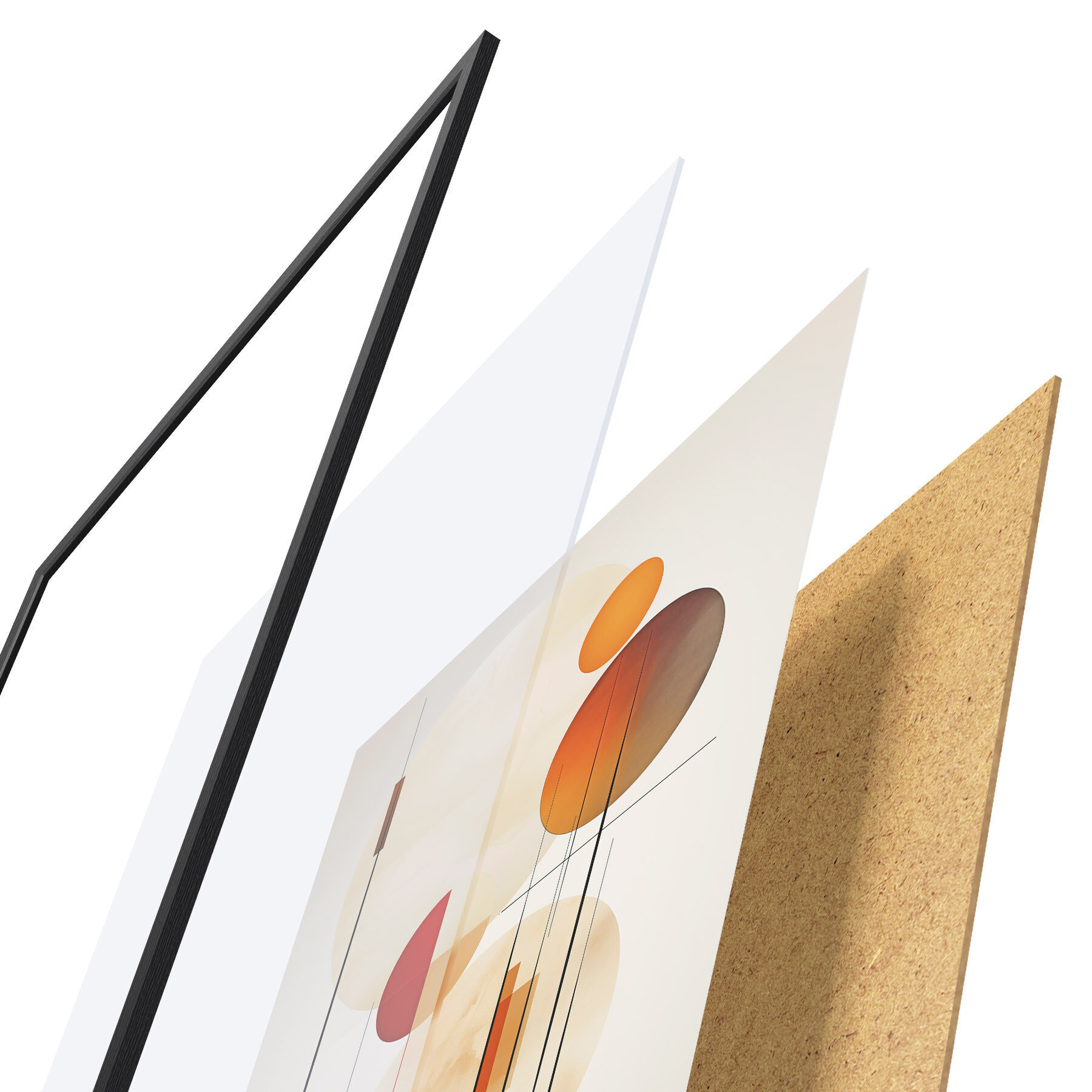 De poster bestaat uit een frame, plexiglas, geprinte afbeelding en spaanplaat achterkant. De poster kan meteen aan de muur worden gehangen dankzij de bevestigingen op de achterkant.