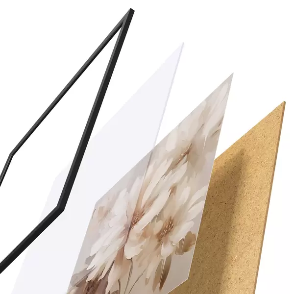 De poster bestaat uit een frame, plexiglas, geprinte afbeelding en spaanplaat achterkant. De poster kan meteen aan de muur worden gehangen dankzij de bevestigingen op de achterkant.