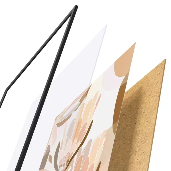 De poster bestaat uit een frame, plexiglas, geprinte afbeelding en spaanplaat achterkant. De poster kan meteen aan de muur worden gehangen dankzij de bevestigingen op de achterkant.