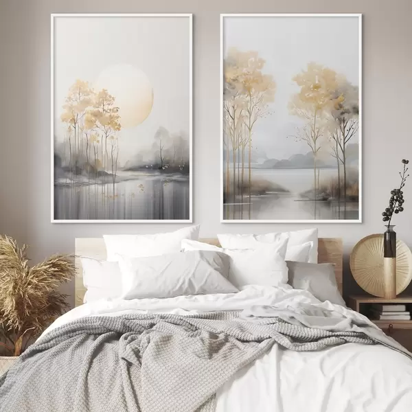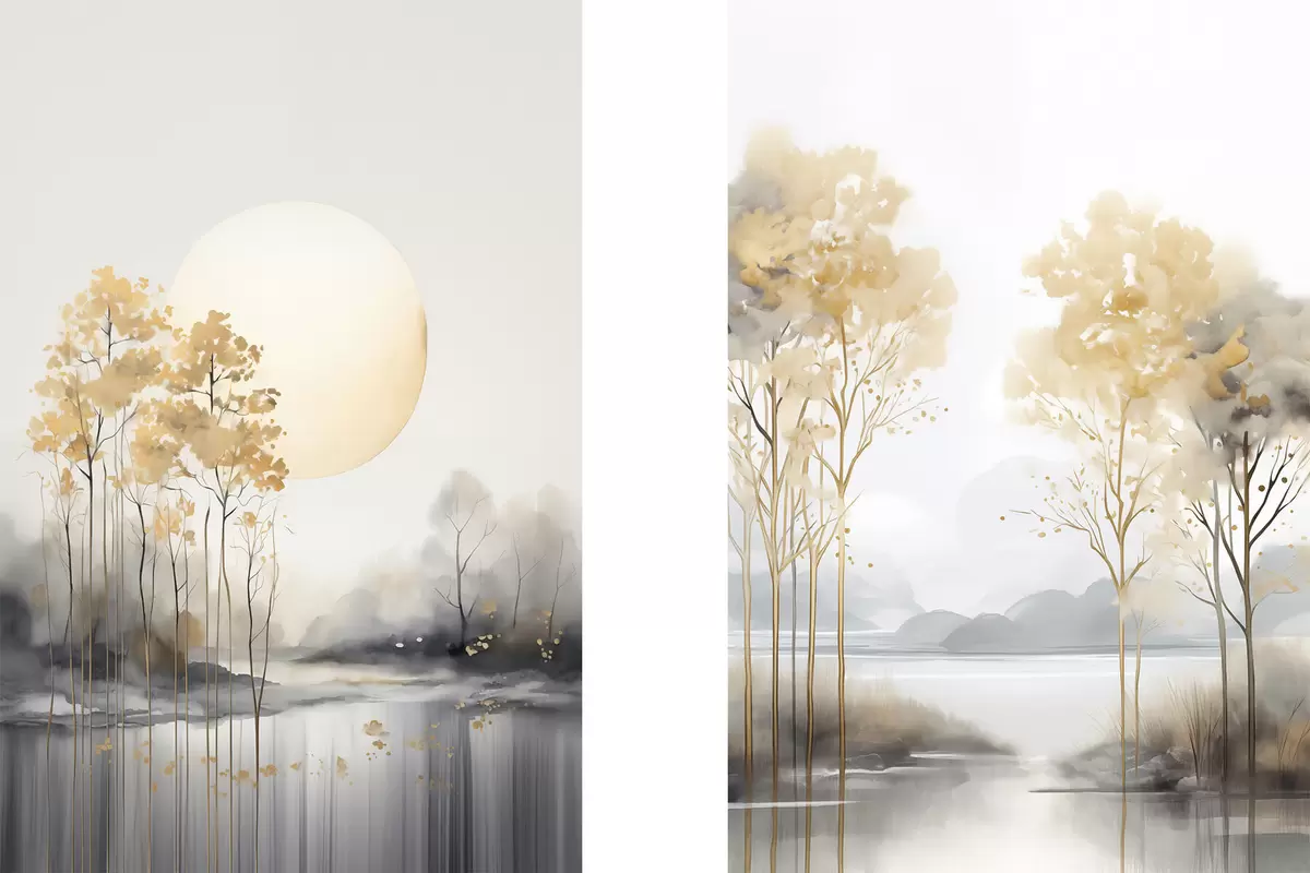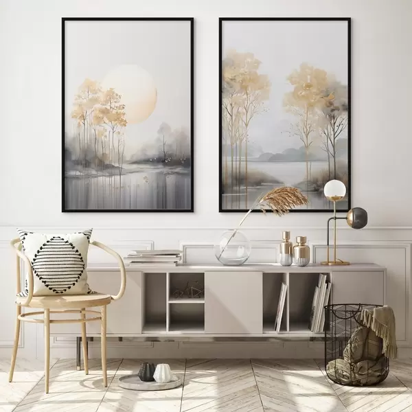 Poster Decoratief abstract landschap, hoge bomen met gele bladeren, een rivier en mist op de achtergrond N° d01115