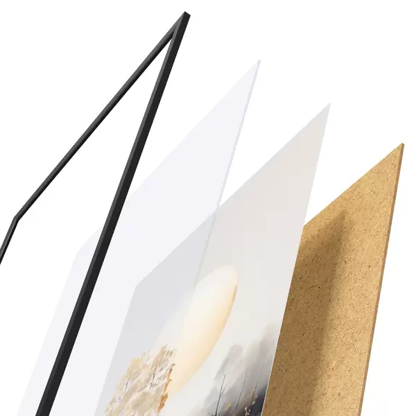 De poster bestaat uit een frame, plexiglas, geprinte afbeelding en spaanplaat achterkant. De poster kan meteen aan de muur worden gehangen dankzij de bevestigingen op de achterkant.