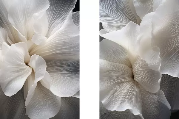 Poster Close-up van delicate abstracte witte bloemblaadjes met ingewikkelde lijnen en een wazige donkere achtergrond N° d01117