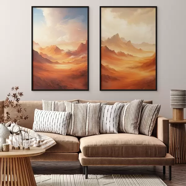 Poster Een uitgestrekt, oranje woestijnlandschap met torenhoge, rotsachtige bergen onder een wazige, zonovergoten hemel met dunne wolken. N° d01122