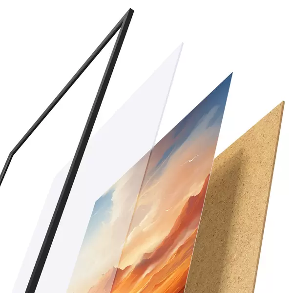 De poster bestaat uit een frame, plexiglas, geprinte afbeelding en spaanplaat achterkant. De poster kan meteen aan de muur worden gehangen dankzij de bevestigingen op de achterkant.