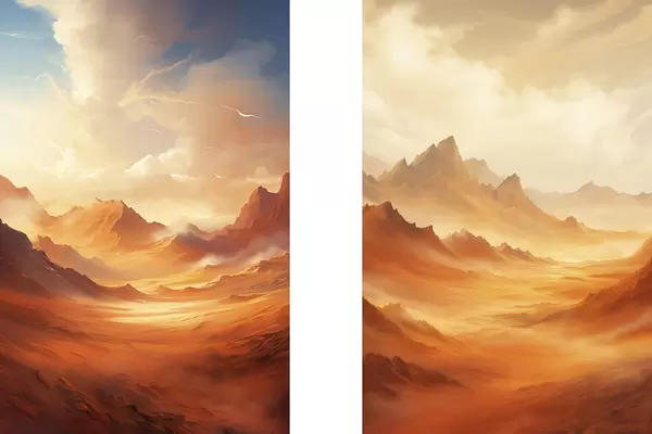 Poster Een uitgestrekt, oranje woestijnlandschap met torenhoge, rotsachtige bergen onder een wazige, zonovergoten hemel met dunne wolken. N° d01122
