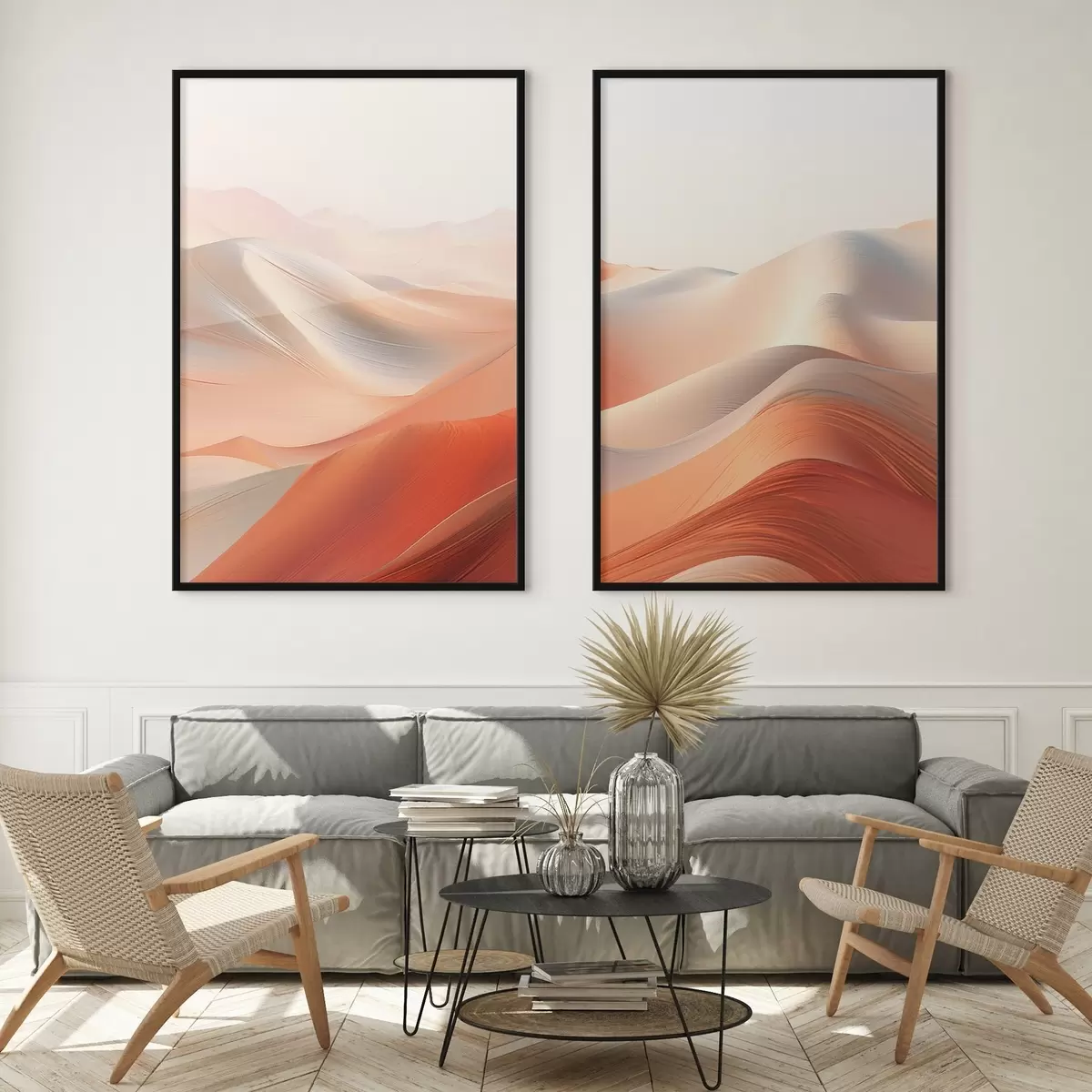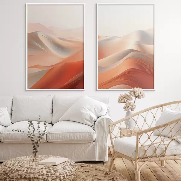 Poster Abstract woestijnlandschap met vloeiende zandduinen in warme oranje en witte tinten d01123