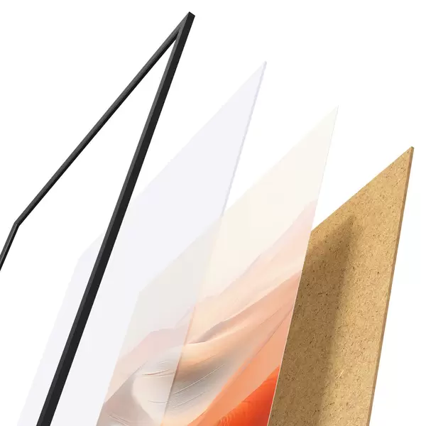 De poster bestaat uit een frame, plexiglas, geprinte afbeelding en spaanplaat achterkant. De poster kan meteen aan de muur worden gehangen dankzij de bevestigingen op de achterkant.