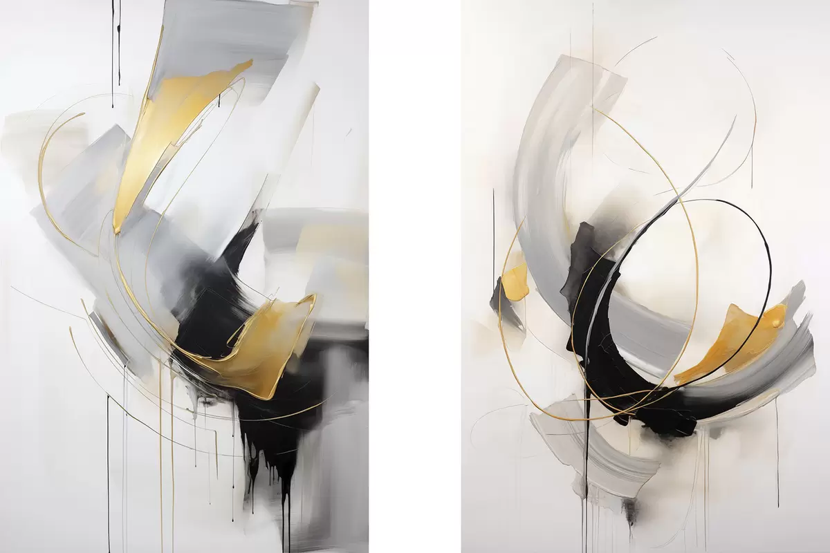 Poster Abstract schilderij met gele en zwart-witte penseelstreken, dynamische lijnen N° d01125