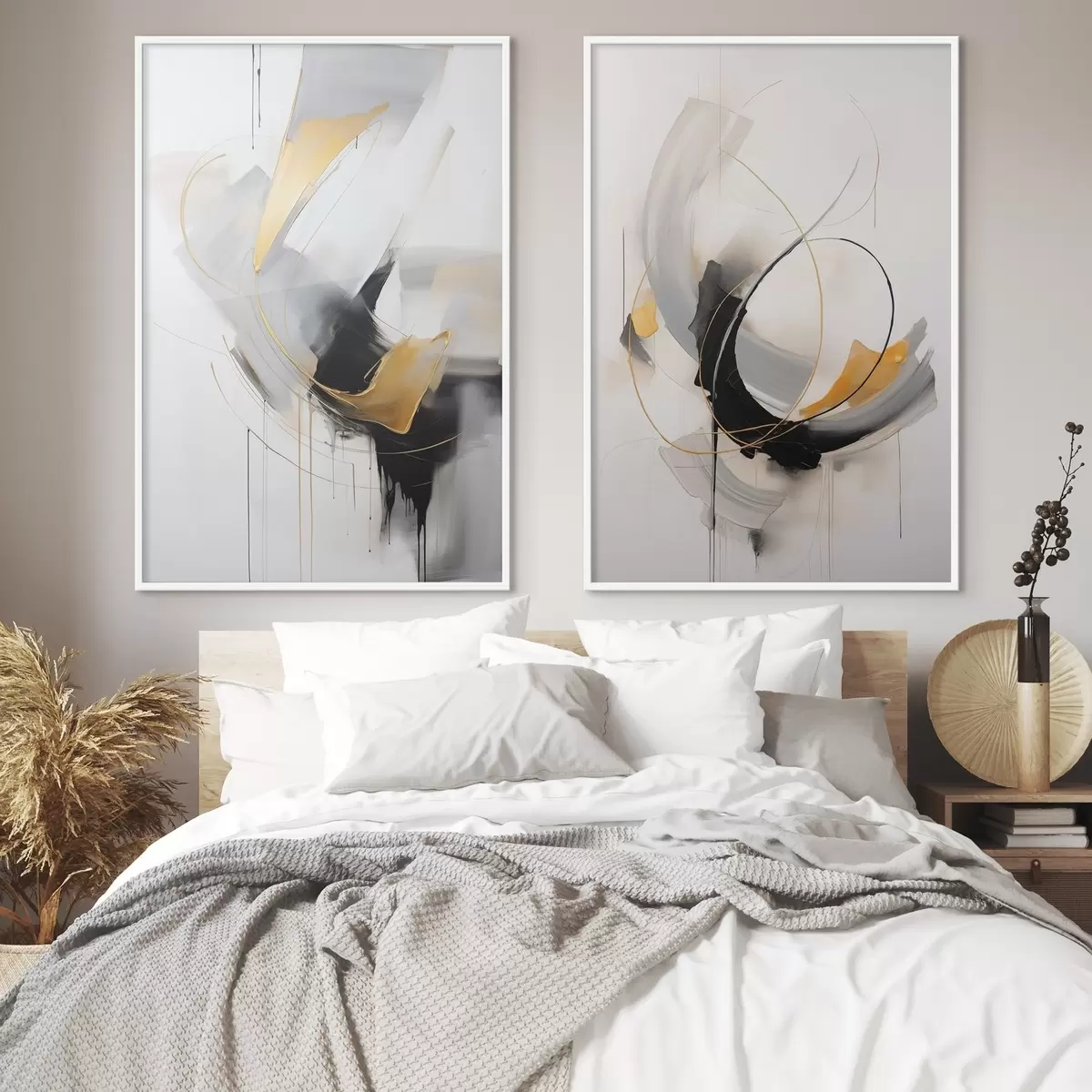 Poster Abstract schilderij met gele en zwart-witte penseelstreken, dynamische lijnen d01125