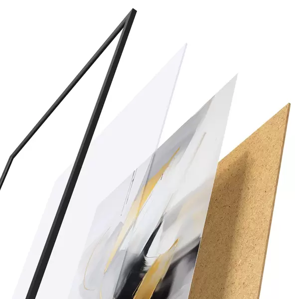 De poster bestaat uit een frame, plexiglas, geprinte afbeelding en spaanplaat achterkant. De poster kan meteen aan de muur worden gehangen dankzij de bevestigingen op de achterkant.