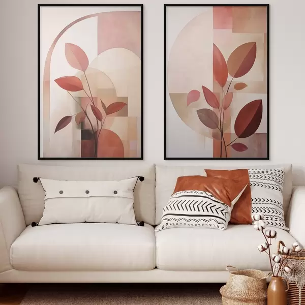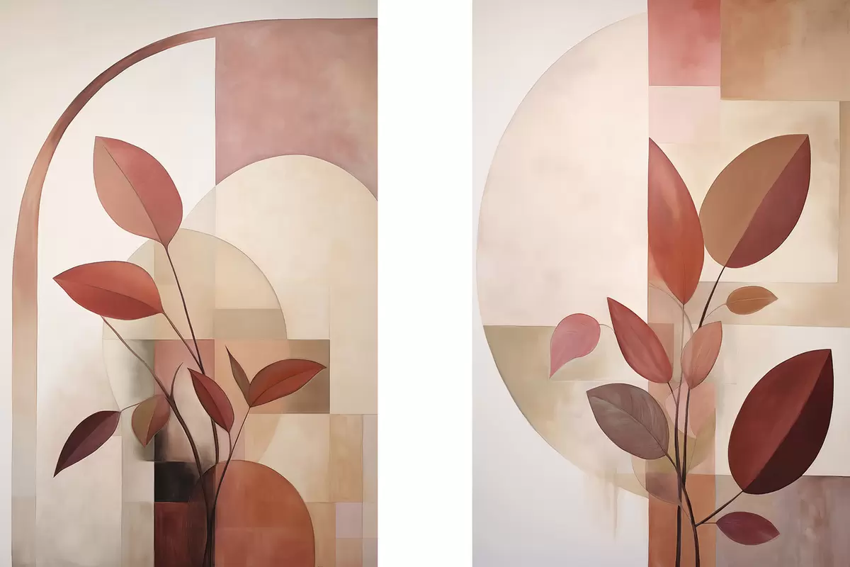 Poster Abstracte plant met rode bladeren tegen een achtergrond van geometrische vormen en zachte, gedempte kleuren N° d01128