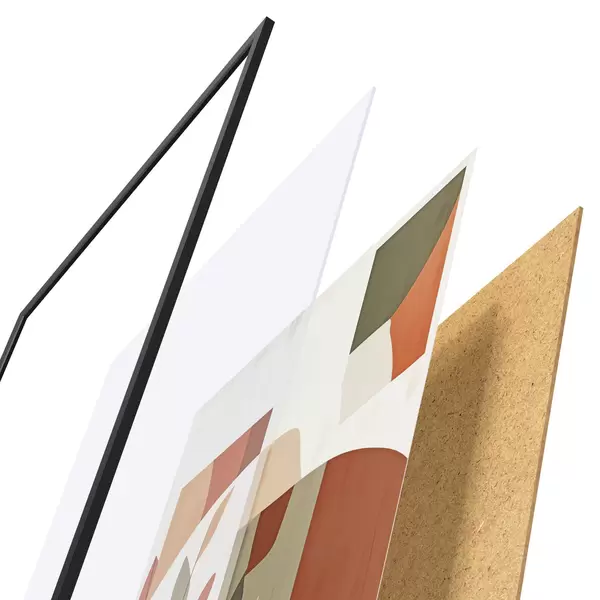 De poster bestaat uit een frame, plexiglas, geprinte afbeelding en spaanplaat achterkant. De poster kan meteen aan de muur worden gehangen dankzij de bevestigingen op de achterkant.