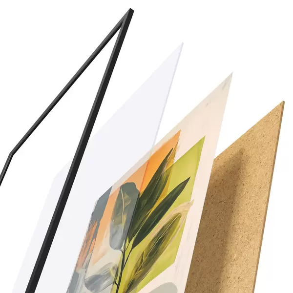 De poster bestaat uit een frame, plexiglas, geprinte afbeelding en spaanplaat achterkant. De poster kan meteen aan de muur worden gehangen dankzij de bevestigingen op de achterkant.