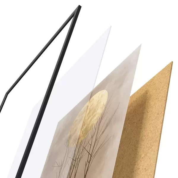 De poster bestaat uit een frame, plexiglas, geprinte afbeelding en spaanplaat achterkant. De poster kan meteen aan de muur worden gehangen dankzij de bevestigingen op de achterkant.