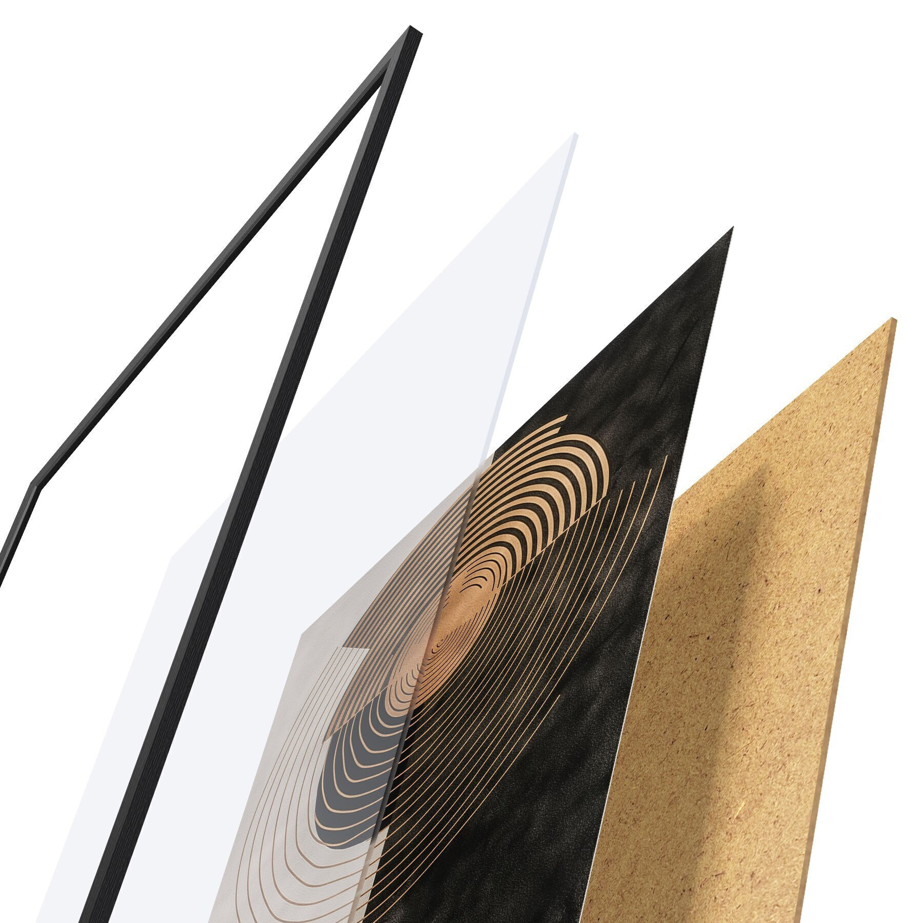 De poster bestaat uit een frame, plexiglas, geprinte afbeelding en spaanplaat achterkant. De poster kan meteen aan de muur worden gehangen dankzij de bevestigingen op de achterkant.