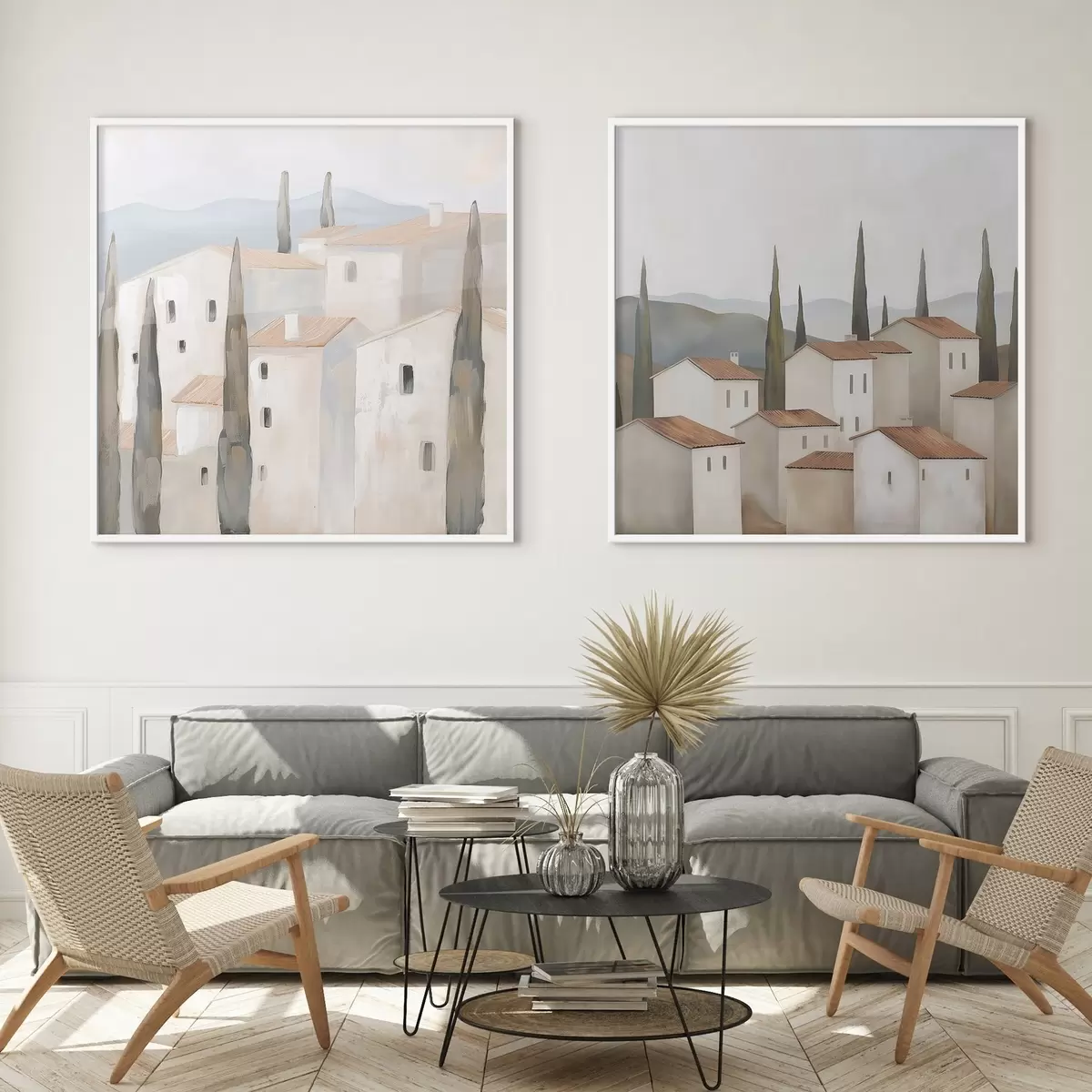 Je kunt het schilderij ophangen aan schroeven. Hiervoor leveren we bevestigingen bij onze foto's, zodat je de foto gemakkelijk kunt ophangen.