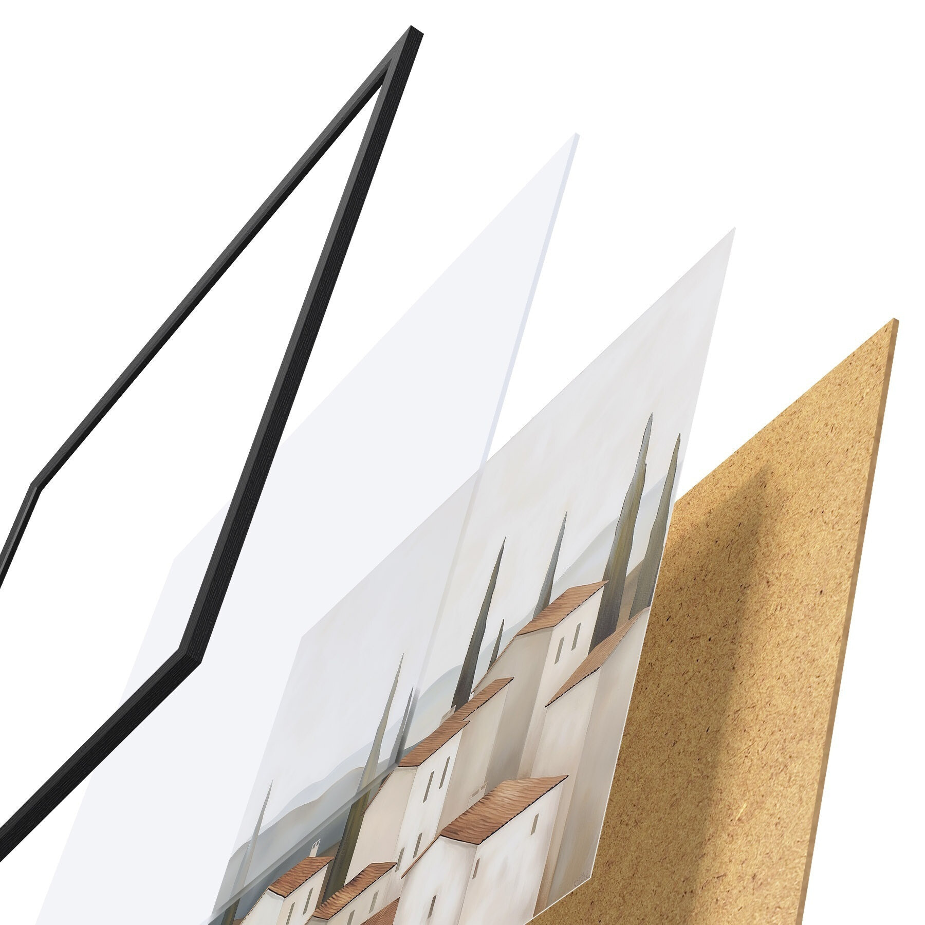 De poster bestaat uit een frame, plexiglas, geprinte afbeelding en spaanplaat achterkant. De poster kan meteen aan de muur worden gehangen dankzij de bevestigingen op de achterkant.