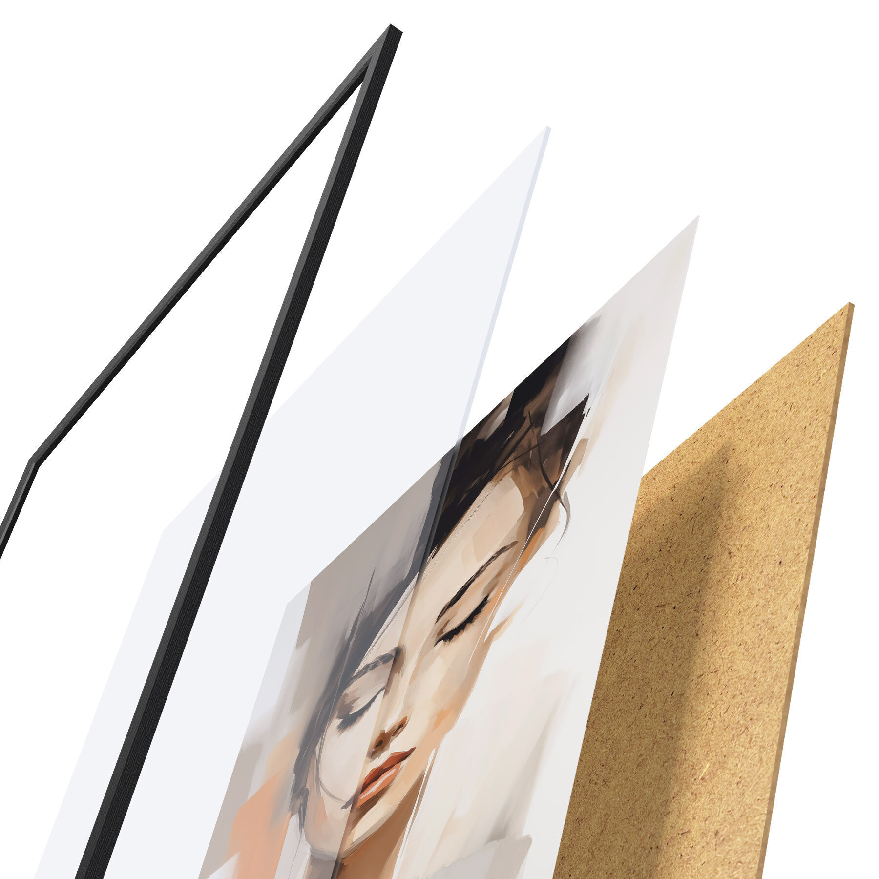 De poster bestaat uit een frame, plexiglas, geprinte afbeelding en spaanplaat achterkant. De poster kan meteen aan de muur worden gehangen dankzij de bevestigingen op de achterkant.