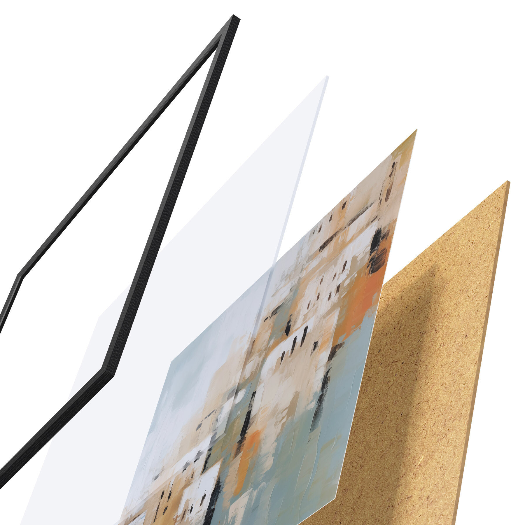 De poster bestaat uit een frame, plexiglas, geprinte afbeelding en spaanplaat achterkant. De poster kan meteen aan de muur worden gehangen dankzij de bevestigingen op de achterkant.