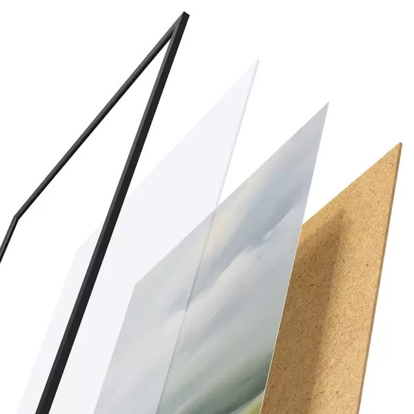 De poster bestaat uit een frame, plexiglas, geprinte afbeelding en spaanplaat achterkant. De poster kan meteen aan de muur worden gehangen dankzij de bevestigingen op de achterkant.