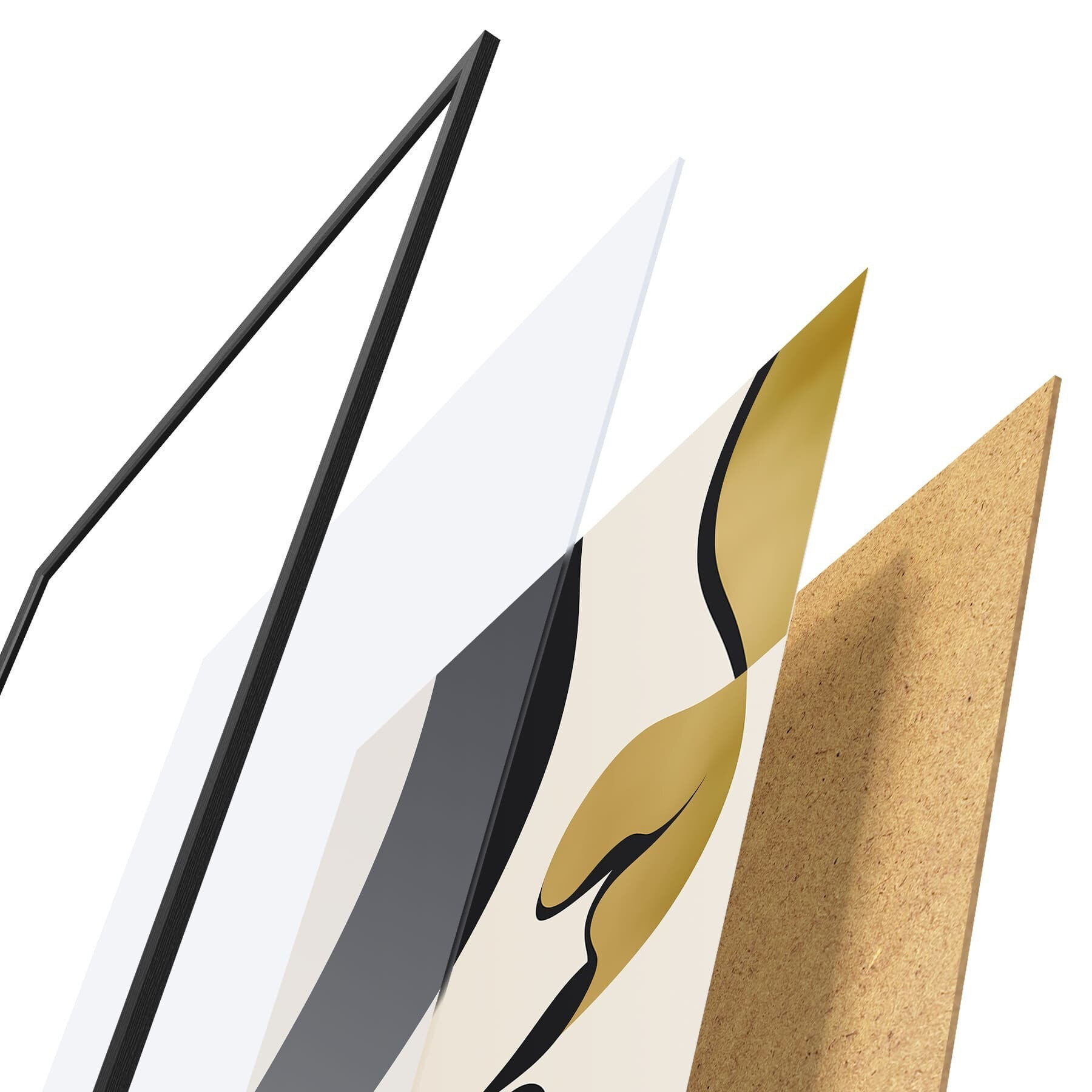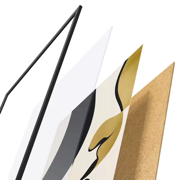 De poster bestaat uit een frame, plexiglas, geprinte afbeelding en spaanplaat achterkant. De poster kan meteen aan de muur worden gehangen dankzij de bevestigingen op de achterkant.
