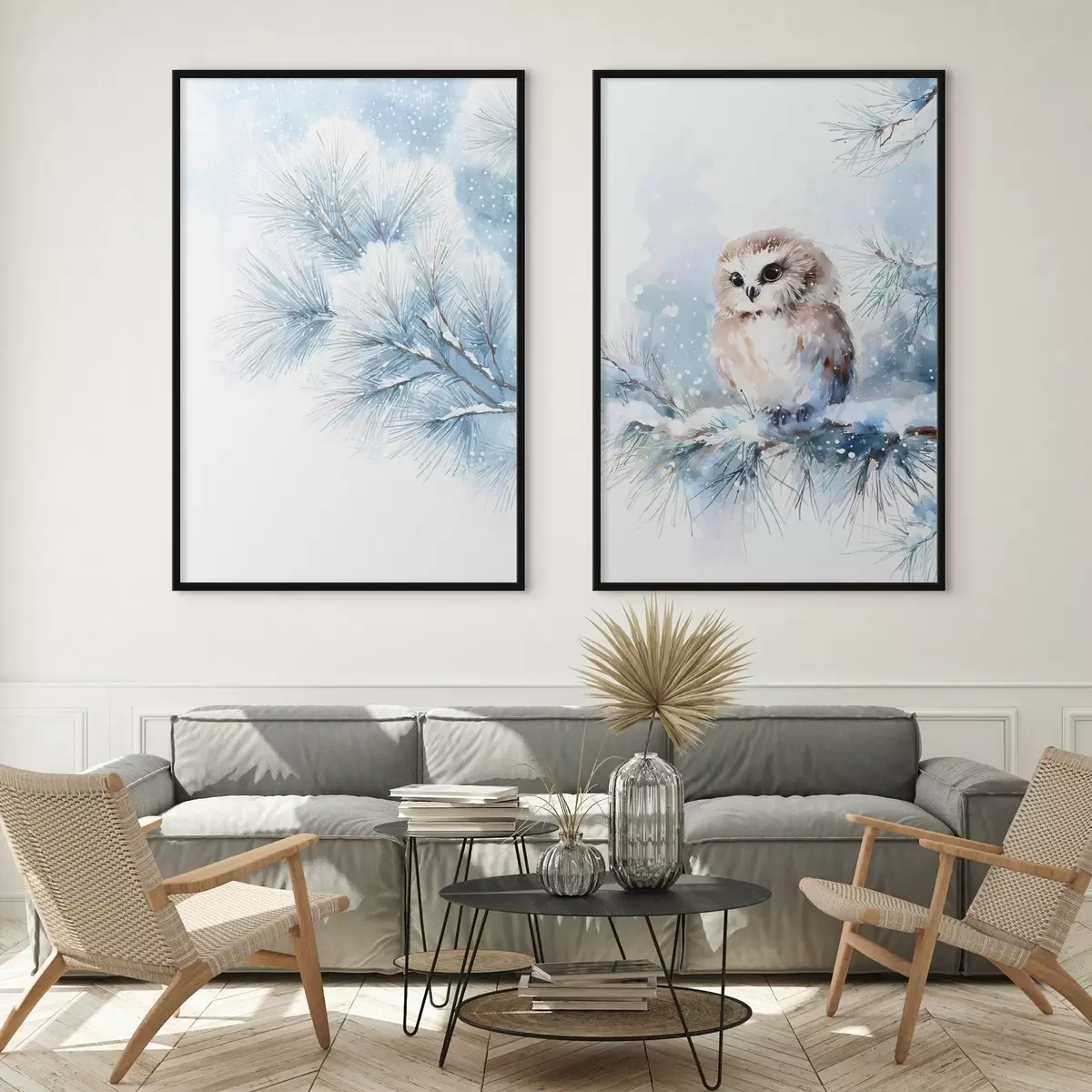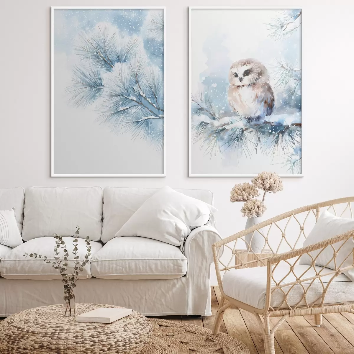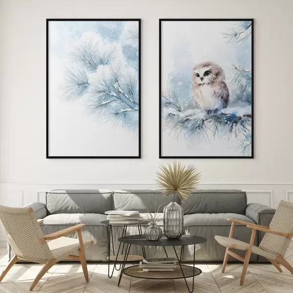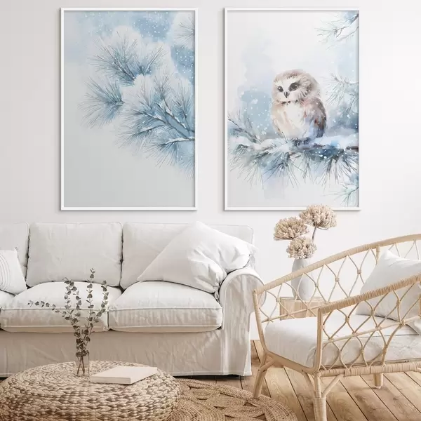 Poster schattige uil op een met sneeuw bedekte dennenboomtak in aquarelstijl N° d01168