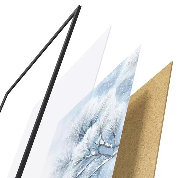 De poster bestaat uit een frame, plexiglas, geprinte afbeelding en spaanplaat achterkant. De poster kan meteen aan de muur worden gehangen dankzij de bevestigingen op de achterkant.