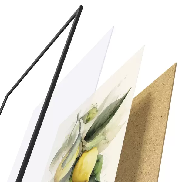 De poster bestaat uit een frame, plexiglas, geprinte afbeelding en spaanplaat achterkant. De poster kan meteen aan de muur worden gehangen dankzij de bevestigingen op de achterkant.