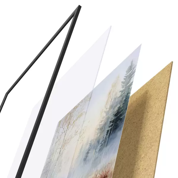 De poster bestaat uit een frame, plexiglas, geprinte afbeelding en spaanplaat achterkant. De poster kan meteen aan de muur worden gehangen dankzij de bevestigingen op de achterkant.