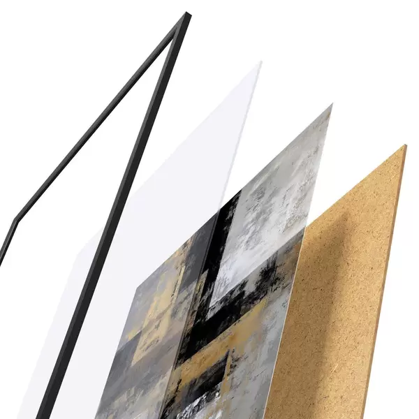 De poster bestaat uit een frame, plexiglas, geprinte afbeelding en spaanplaat achterkant. De poster kan meteen aan de muur worden gehangen dankzij de bevestigingen op de achterkant.